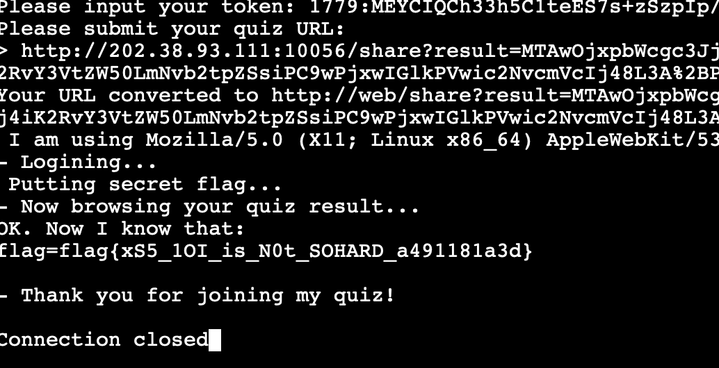 1 2 3 4 5 6 7 8 9 10 11 12 13 14 15 16 17 18 19 20 21 22 23 24 25 26 27 28 29 30 31 32 33 34 35 36 37 38 39 40 41 42 43 44 import requestsrange = [0 , 500000 , 1000000 ]token = "" url_login = "http://202.38.93.111:18000/" url_submit = "http://202.38.93.111:18000/state" session = requests.session() session.get(url_login, params={'token' : token}) i = 0 while True : i += 1 num = range [1 ] / 1000000 session.post( url=url_submit, headers={ "Content-Type" : "text/plain;charset=UTF-8" , "authorization" : "Bearer " + token }, data="<state><guess>%.6f</guess></state>" % num ) resp = session.get( url=url_submit, headers={ "authorization" : "Bearer " + token } ) if 'guess' not in resp.text: if 'flag' in resp.text: print ('%s %.6f flag' % (i, num)) exit(0 ) else : print ('%s %.6f right' % (i, num)) range [0 ] = 0 range [2 ] = 1000000 else : if 'more="true"' in resp.text: print ('%s %.6f more' % (i, num)) range [2 ] = range [1 ] if 'less="true"' in resp.text: print ('%s %.6f less' % (i, num)) range [0 ] = range [1 ] range [1 ] = round ((range [0 ] + range [2 ]) / 2 )
