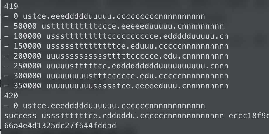 1 2 3 4 5 6 7 8 9 10 11 12 13 14 15 16 17 18 19 20 21 22 23 24 25 26 27 28 29 30 31 32 33 import jsonimport itertoolsfrom hashlib import sha384from re import Iimport systarget = 'ec18f9dbc4aba825c7d4f9c726db1cb0d0babf47fa170f33d53bc62074271866a4e4d1325dc27f644fdad' def permutation (li ): return list (itertools.permutations(li)) with open ('test.json' ) as f: d = json.load(f) for iii, da in enumerate (d[int (sys.argv[1 ]):int (sys.argv[2 ])]): p = permutation(da) print (iii) for iiii, data in enumerate (p): string = 'u' * data[0 ] + 's' * data[1 ] + 't' * data[2 ] + 'c' * data[3 ] + 'e.' +\ 'e' * data[4 ] + 'd' * data[5 ] + 'u' * data[6 ] + '.' +\ 'c' * data[7 ] + 'n' * data[8 ] if iiii % 50000 == 0 : print ('-' , iiii, string) result = sha384(string.encode()).hexdigest() i = 0 flag = False for ii, x in enumerate (target): res = result.find(x, i) if res != -1 : i = res else : break if ii == len (target) - 1 : print ('success' , string, result) exit()