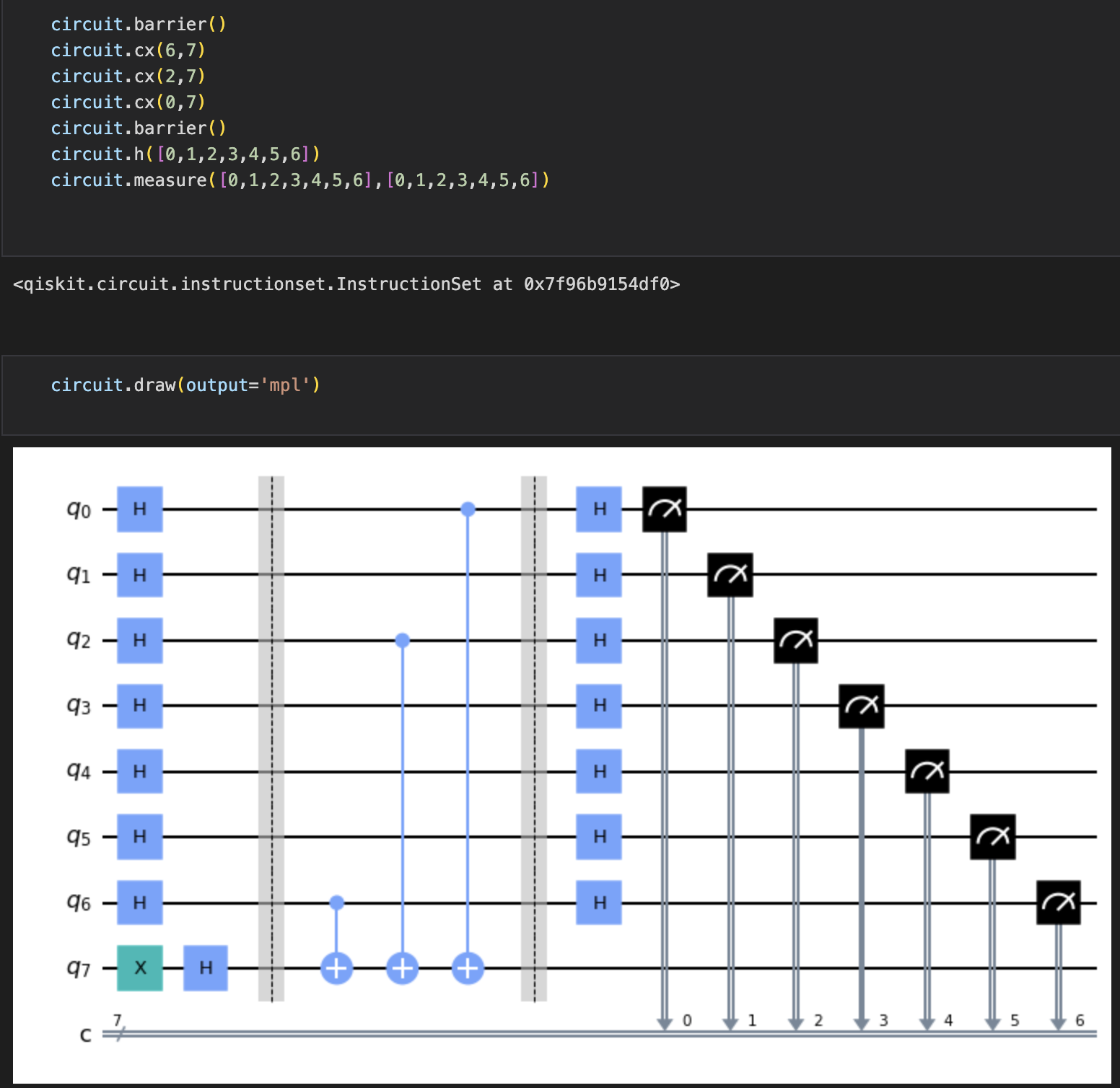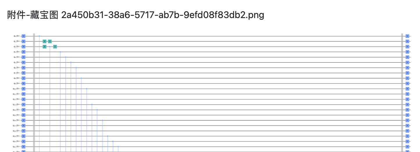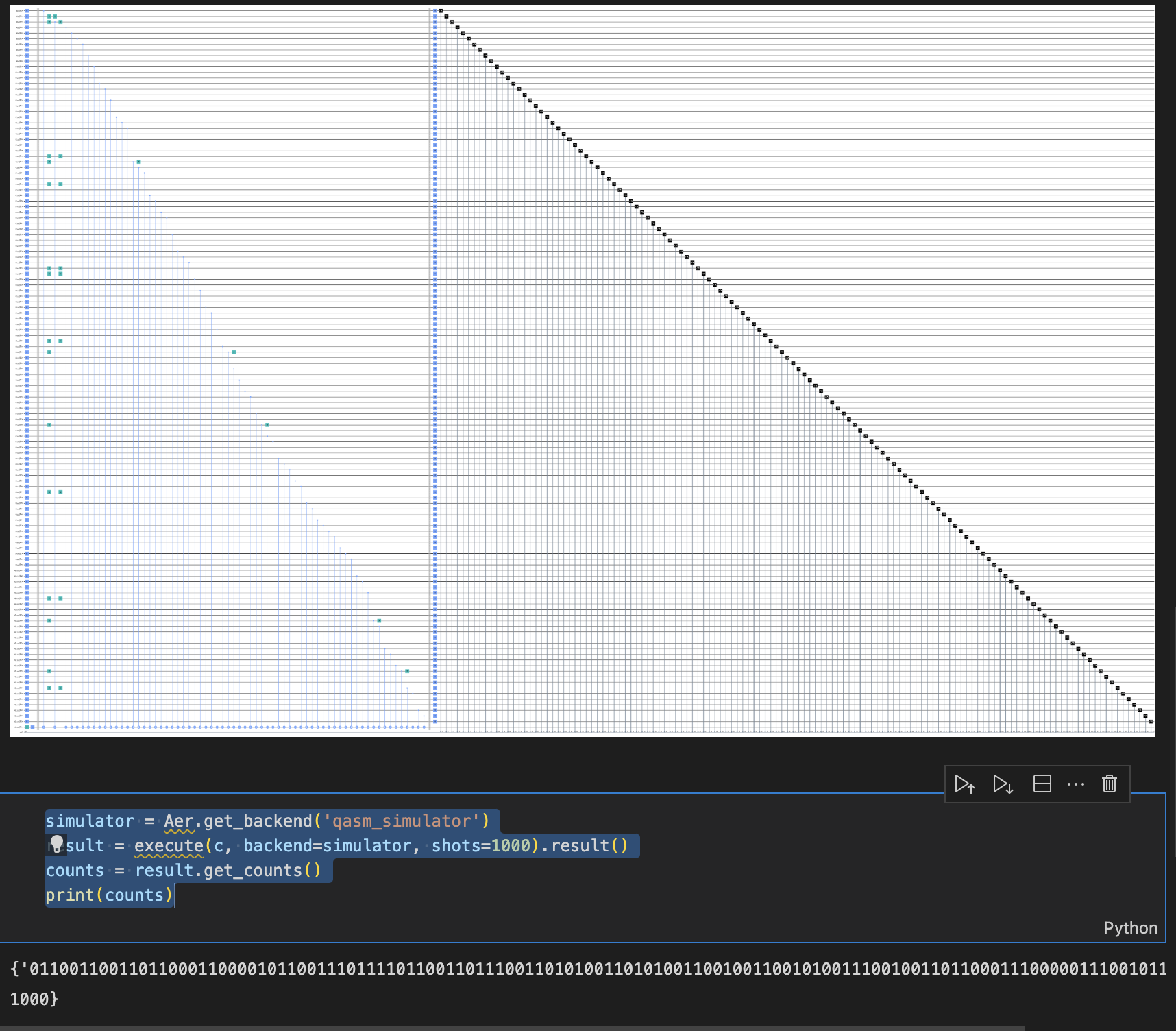1 2 3 4 5 6 7 8 9 10 11 12 13 14 15 16 17 18 19 20 21 22 23 24 25 26 27 28 29 30 31 32 33 34 35 36 37 38 %matplotlib inline from qiskit import *c = QuantumCircuit(129 ,128 ) c.h(list (range (0 , 128 ))) c.x(128 ) c.h(128 ) c.barrier() c.cx(0 , 128 ) c.x(1 ) c.z(2 ) c.x(26 ) c.z(27 ) c.x([31 , 46 ]) c.z(47 ) '''中间省略 114514 行''' c.cx(115 , 128 ) c.cx(117 , 128 ) c.cx(118 , 128 ) c.x(118 ) c.cx(121 , 128 ) c.cx(122 , 128 ) c.cx(125 , 128 ) c.cx(126 , 128 ) c.barrier() c.h(list (range (0 , 128 ))) c.measure(list (range (0 , 128 )),list (range (0 , 128 ))) c.draw(output='mpl' , initial_state=True , fold=-1 ) simulator = Aer.get_backend('qasm_simulator' ) result = execute(c, backend=simulator, shots=1000 ).result() counts = result.get_counts() print (counts)