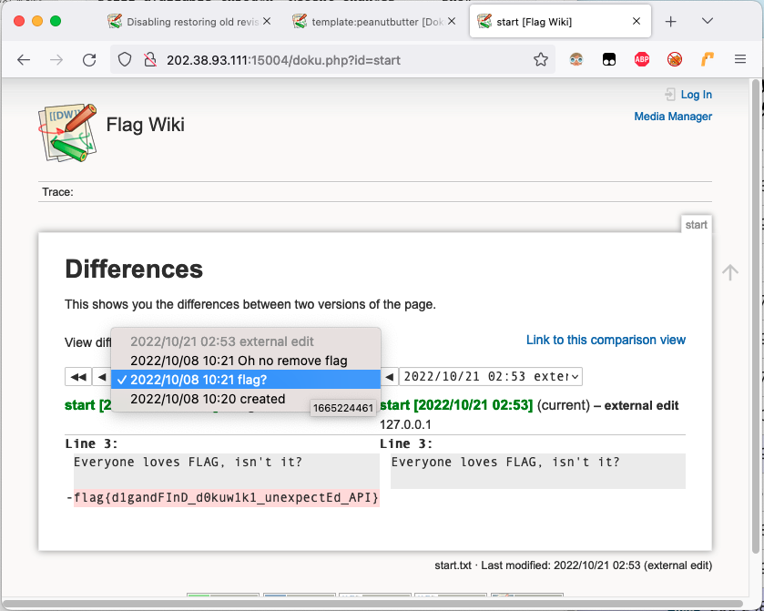 在 DokuWiki 官网进入 Show differences to current revisions,得到链接 do=diff,丢进题设 Wiki 中,得到 flag。